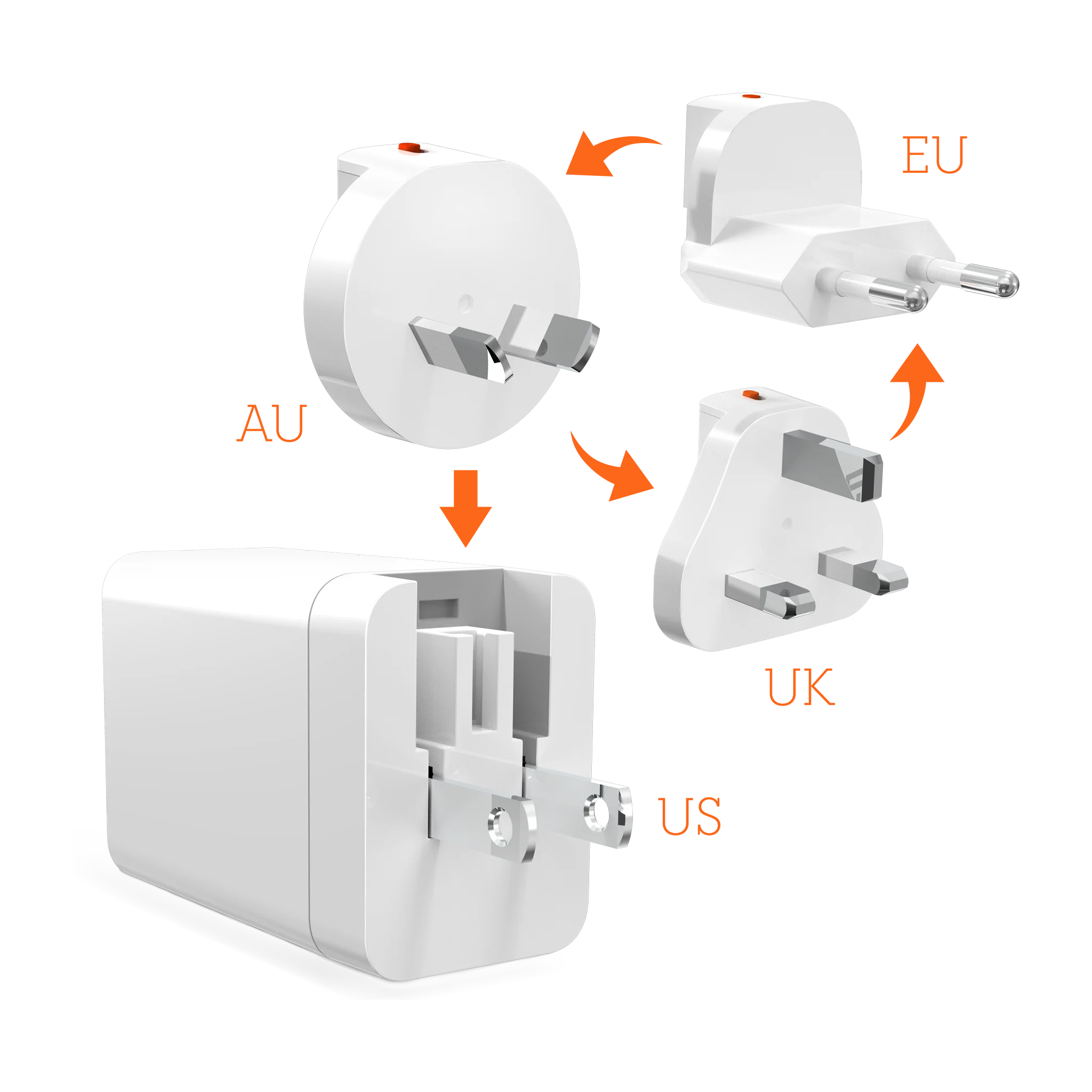 The STM GaN 65W dual USB-C/A Universal Travel Power Adapter offers fast, efficient charging at home, in the office, or on the go. Travel the globe smarter with an integrated US plug and quick quick snap adapters for UK, EU, and AU.